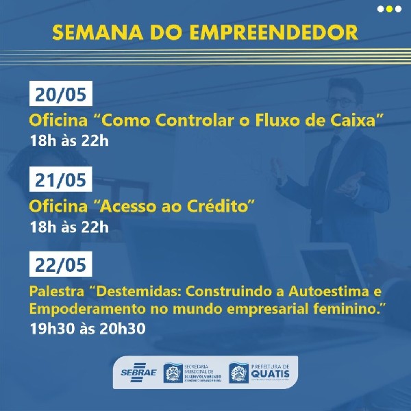 Evento acontece de 20 a 24 de maio, no Centro de Atendimento ao Trabalhador e Empreendedor (CATE) do município.As inscrições para a Semana do Empreendedor de Quatis, em parceria com o Sebrae Médio Paraíba, seguem abertas até a próxima sexta-feira (17). Contudo, a Prefeitura divulgou, nesta terça-feira (14), a programação atualizada das oficinas agendadas para a semana. As mudanças vão para a programação do dia 22, com a palestra “Destemidas: Construindo a Autoestima e Empoderamento no mundo empresarial feminino.”, que acontece das 19h30 às 20h30. Outra mudança no calendário vai para o último dia da programação, no dia 24, que terá a oficina Marketing Digital. A oficina está marcada para acontecer a partir das 18 horas, com previsão de término às 22h.A Semana do Empreendedor de Quatis vai acontecer entre os dias 20 e 24 de maio, no Centro de Atendimento ao Trabalhador e Empreendedor (CATE). A iniciativa visa capacitar os empreendedores da cidade com oficinas em diversas áreas, como administração, vendas, negócios e marketing. Para se inscrever, os interessados devem ter, no mínimo, 18 anos de idade. Basta procurar o CATE, situado na Rua Nossa Senhora do Rosário, nº 185, no Centro, tendo em mãos documentos pessoais como RG e CPF. O local funciona de segunda à sexta, das 8h às 17 horas.Veja a programação completa e atualizada:20/05Oficina “Como Controlar o Fluxo de Caixa”18h às 22h21/05Oficina “Acesso ao Crédito”18h às 22h22/05Palestra “Destemidas: Construindo a Autoestima e Empoderamento no mundo empresarial feminino.”19h30 às 20h3023/05Oficina “Como Definir o Preço de Venda”18h às 22h24/05Oficina “Marketing Digital”18h às 22h