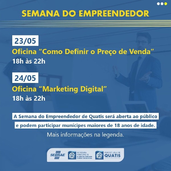 ções para a Semana do Empreendedor de Quatis, em parceria com o Sebrae Médio Paraíba, seguem abertas até a próxima sexta-feira (17). Contudo, a Prefeitura divulgou, nesta terça-feira (14), a programação atualizada das oficinas agendadas para a semana. As mudanças vão para a programação do dia 22, com a palestra “Destemidas: Construindo a Autoestima e Empoderamento no mundo empresarial feminino.”, que acontece das 19h30 às 20h30. Outra mudança no calendário vai para o último dia da programação, no dia 24, que terá a oficina Marketing Digital. A oficina está marcada para acontecer a partir das 18 horas, com previsão de término às 22h.