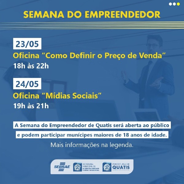 ça no próximo dia 20 e segue até 24 de maio, a Semana do Empreendedor de Quatis. O evento é uma iniciativa da Prefeitura Municipal, que vai ofertar cinco dias de palestras e oficinas empreendedoras totalmente gratuitas. O objetivo é capacitar os empreendedores da cidade com oficinas em diversos temas, como administração, vendas, negócios e mídias digitais. As capacitações terão parceria com o Sebrae Médio Paraíba, através do “MEI em Movimento”. O programa conta com uma programação anual de palestras e oficinas que serão realizadas ao longo do ano na cidade.