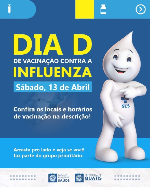 O Dia D da Gripe (Influenza) também estará na programação da 6ª edição do Ação Quatis, que acontece neste sábado, no bairro Jardim Polastri. A vacinação acontecerá na Unidade de Saúde ESF IV Conselheira Neuza Pacheco.
