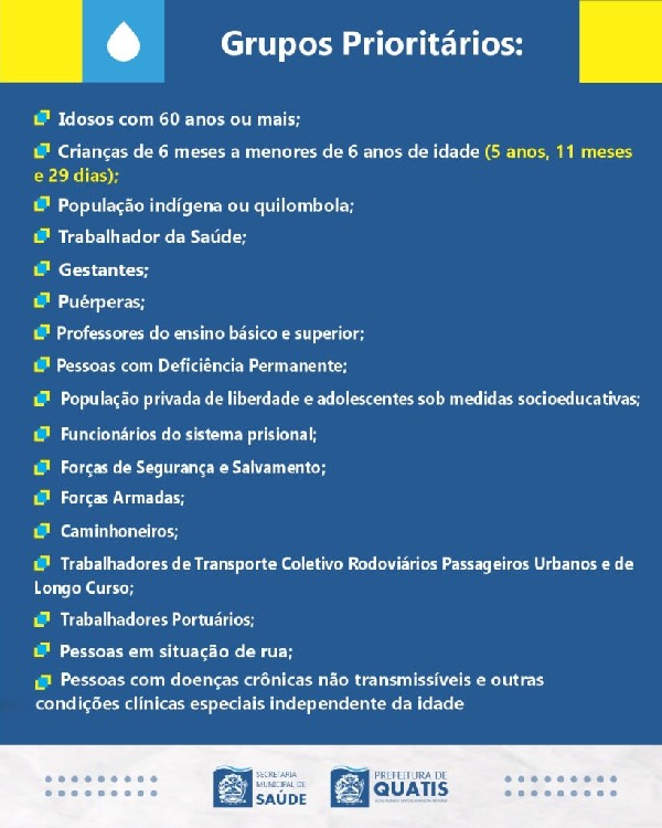 A Prefeitura de Quatis realiza neste sábado, dia 13, o Dia D da Campanha Nacional de Vacinação contra a Gripe (Influenza). A ação vai acontecer das 9h às 16 horas em todas as Unidades Básicas de Saúde (UBS) do município. Já nos distritos Falcão e Ribeirão de São Joaquim, a imunização vai acontecer em horário reduzido, entre 9h e meio-dia, em virtude de baixa demanda. Nesta etapa, estão sendo vacinados grupos prioritários ou com comorbidades, seguindo a nota técnica do Governo do Estado. Veja quem pode vacinar: