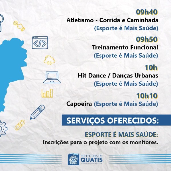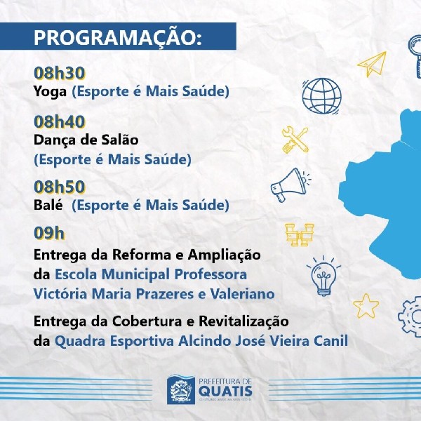A Prefeitura de Quatis vai realizar neste sábado, dia 13, a 6ª edição do ‘Ação Quatis’. Idealizado pela Administração Municipal, o evento tem como objetivo levar os serviços das secretarias municipais para mais perto da população e promover diversas ações gratuitas em espaço público. O ‘Ação Quatis’ vai acontecer das 8h às 12 horas, no Parque Municipal José Pereira da Rocha ‘Sargento’, mais conhecido como Parque da Cidade, no bairro Jardim Polastri. O local contará com uma extensa programação de atividades de recreação, serviços públicos e atendimentos em saúde para a população.A 6ª edição ainda contará com abertura oficial, a partir das 9 horas, com a presença do prefeito Aluísio d’Elias e autoridades. Neste dia, a Prefeitura também vai realizar a entrega da obra de reforma da Escola Municipal Profª Victória Maria Prazeres e Valeriano, o “Victorinha”, e da Quadra de Esportes Alcindo José Vieira Canil.A Secretaria Municipal de Educação (SME) ainda estará realizando exposição de trabalhos dos alunos da escola. No local, brinquedos infláveis para a criançada também estão garantidos. Confira e saiba mais o que vai ser destaque no dia:Saúde:Vigilância Sanitária:Pedidos de Raticidas, Moluscidas;Ficha de cadastro para castração;Pedidos de visitas domiciliares dos agentes de endemias;Atendimento na Unidade de Saúde do bairro (ESF IV):Vacinação contra a Influenza;Tenda DANT (com aferição de pressão e de glicemia);Consultas com especialistas por agendamento;Consultas com Clínico Geral, livre demanda.Assistência Social:Atendimentos dos programas sociais do Governo Federal (CadÚnico e Bolsa Família)Esporte:Inscrições para o projeto Esporte é Mais Saúde, com apresentações de aulas nas modalidades:Yoga: a partir das 8h30Dança de Salão: a partir das 8h40Balé: a partir das 8h50Atletismo (Corrida e Caminhada): a partir das 9h40Treinamento Funcional: a partir das 9h50Hit Dance e Danças Urbanas: a partir das 10 horasCapoeira: a partir das 10h10