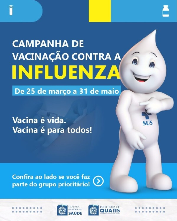 ção contra o vírus da gripe (Influenza) continua. Nesta primeira etapa, estão sendo vacinadas pessoas pertencentes a grupos prioritários ou com comorbidades. Veja na imagem e saiba mais! A campanha segue até o dia 31 de maio.