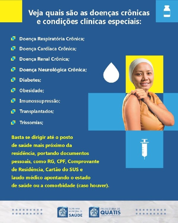 A Campanha de Vacinação contra o vírus da gripe (Influenza) continua. Nesta primeira etapa, estão sendo vacinadas pessoas pertencentes a grupos prioritários ou com comorbidades. Veja na imagem e saiba mais! A campanha segue até o dia 31 de maio.A gripe/influenza é uma infecção viral aguda que afeta o sistema respiratório. A Secretaria Municipal de Saúde (SMS) ressalta que a vacinação é importante, pois protege os indivíduos, principalmente os mais vulneráveis, contra a doença.A imunização acontece de segunda à sexta-feira, das 9h às 16 horas, em todas as Unidades Básicas de Saúde (UBS) do município, incluindo Clínica da Família, no bairro Nossa Senhora do Rosário; ESF II, no Mirandópolis; ESF III, no Jardim Independência; ESF IV, no Jardim Polastri; além das UBS’s dos distritos Falcão e Ribeirão de São Joaquim.No caso de gestantes, crianças e adolescentes, que se encaixem em um dos grupos prioritários, a vacinação ocorre no Núcleo de Atenção Integrada à Saúde da Mulher Criança e Adolescente (NAISMCA), antiga Casa da Criança, no centro da cidade.Para a vacinação, basta ter em mãos documentos como CPF e RG, Cartão do SUS e Cartão de Vacinação.A Prefeitura informa que pacientes que pertencem a grupos com doenças crônicas não transmissíveis e outras condições clínicas, devem apresentar laudo médico. Passe a imagem para o lado e confira essas condições!Informamos, ainda, que moradores de comunidades como Joaquim Leite, Quilombola de Santana e Assentamento Irmã Dorothy, serão vacinados através da unidade móvel “Saúde Sobre Rodas”. Portanto, basta ficar atento ao dia que a unidade estará na sua comunidade!
