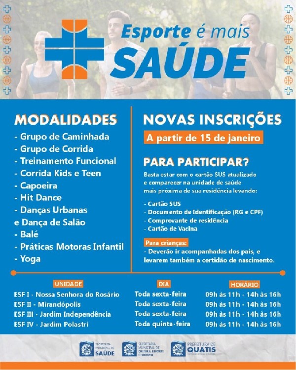 ‘Esporte é Mais Saúde’ começam já na próxima segunda-feira, dia 15. Também neste dia, a Prefeitura de Quatis abrirá novas inscrições do projeto, que está oferecendo dez modalidades esportivas, incluindo Grupo de Caminhada, Grupo de Corrida, Treinamento Funcional, Corrida Kids e Teen, Capoeira, Hit Dance, Danças Urbanas e Dança de Salão, Balé, Práticas Motoras Infantil e Yoga.