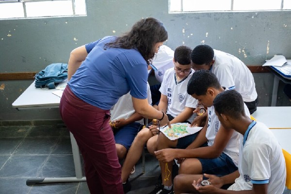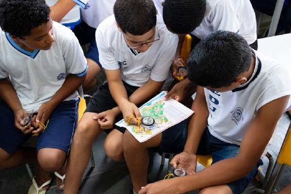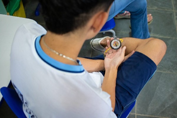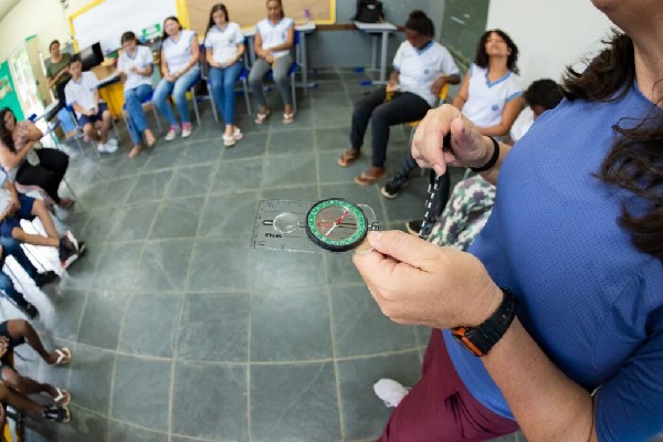 ão, os alunos do 6º ao 9º ano do Ensino Fundamental e do 1º ao 3º ano do Ensino Médio participaram de uma roda de conversa sobre como funciona a bússola e seu uso através do auxílio de mapas. Em seguida, a turma realizou uma atividade prática de orientação, principal ação do projeto. Com o auxílio de um mapa confeccionado por eles, os estudantes tiveram a missão de localizar pontos marcados e encontrar os prismas espalhados pelo local. A ação aconteceu no entorno da escola.