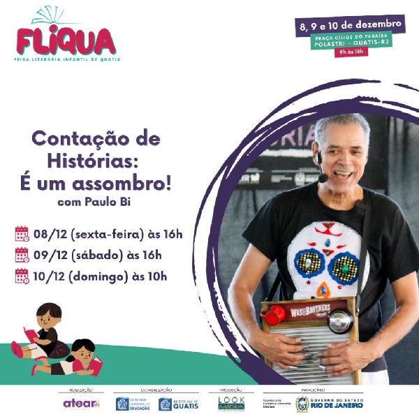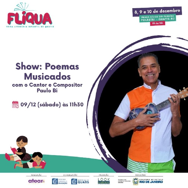 Paulo Bi é compositor e artista experiente em apresentações musicais em diversos países, incluindo Japão, África do Sul, Suíça, Alemanha, Espanha, Argentina, Colômbia, Peru, Uruguai e Guatemala. Ele já lançou vários CDs, incluindo “Festa dos Bichos”, “A Casa do Zé”, “De Paes para Filhos”, “Cantando Histórias” e “Banda da Floresta”. Paulo Bi também participou de diversos eventos musicais, incluindo o Encontro da Canção Infantil Latino-Americana e Caribenha em Buenos Aires, Argentina e Guatemala. Além disso, é coordenador da Rádio Butiá Brasil e membro do MOCILYC (Movimento da Canção Latino-Americana e Caribenha).Prepare-se para uma experiência literária única nos dias 8, 9 e 10 de dezembro, das 9h às 18h, na Praça Cílios do Paraíba, Jardim Polastri, com entrada gratuita!Programação completa no site www.atearproducoes.com.br/fliqua.