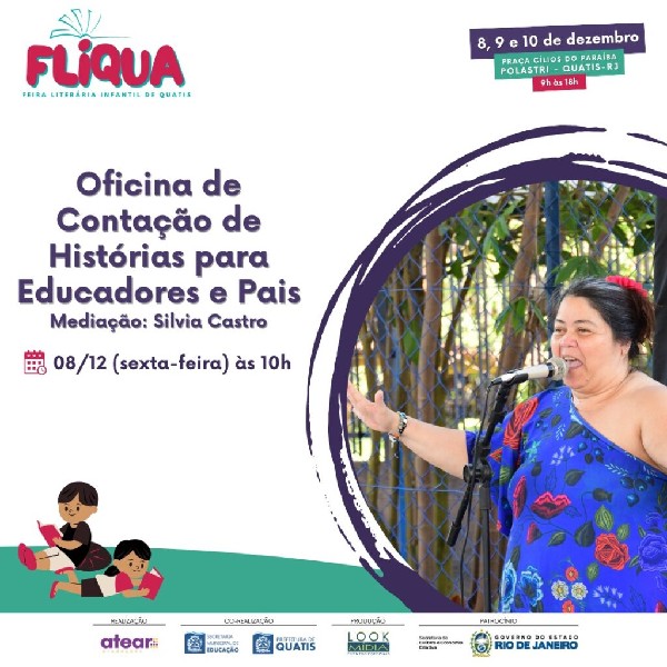 Silvia Castro é atriz, contadora de histórias e educadora. Formada em Letras pela UERJ, pós-graduada em Literatura infanto juvenil pela UCAM, desenvolve atividades diversas nas áreas da leitura e produção de textos há mais de 20 anos. Ganhou moção honrosa na Câmara dos Deputados do RJ, quando foi Supervisora Pedagógica do Projeto Educativo do CCBB. Representou o Brasil em Cuba, México e Colômbia, narrando contos. Publicou seu 1 livro: HISTÓRIAS DE HARMATÃ pela Editora Kimera, em 2019, com grande sucesso. O 2 livro – A SEREIA DE COPACABANA, editado pela editora OGRO traz à cena o protagonismo do meio ambiente, através da personagem que resolve cuidar do lixo que polui a bela praia de Copacabana. O livro esteve em feiras literárias no Rio e fora da cidade. Em novembro de 2021, recebeu destaque no PROJETO PÓLEM na Semana dos Contadores de Histórias, em Santos-SP. Silvia é integrante do MAMI – movimento artístico de música para a infância RJ.Prepare-se para uma experiência literária única nos dias 8, 9 e 10 de dezembro, das 9h às 18h, na Praça Cílios do Paraíba, Jardim Polastri, com entrada gratuita!Programação completa no site www.atearproducoes.com.br/fliqua.