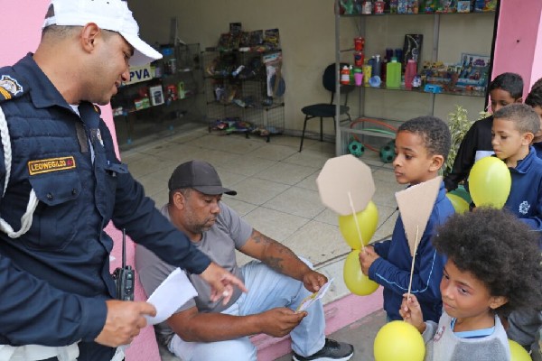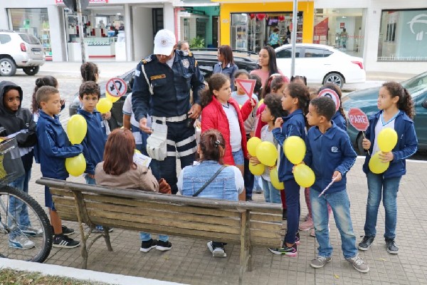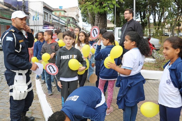 ção, a equipe de Trânsito da Guarda Municipal, junto com os estudantes da escola, realizaram uma caminhada até a Praça Dr. Teixeira Brandão, no centro da cidade, entregando panfletos educativos e orientações aos munícipes que passavam pelo local.