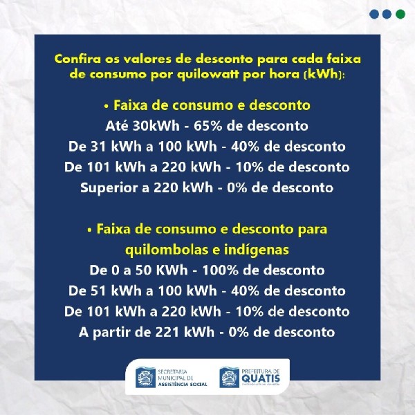 A Prefeitura de Quatis, através da Coordenação do Cadastro Único, vem apresentar o benefício de Tarifa Social de Energia ElétricaO que é a Tarifa Social de Energia?É um benefício social criado pelo Governo Federal para beneficiar as unidades residenciais de famílias com baixa renda, que consiste na redução da tarifa de consumo de energia elétrica. O cadastro é automático para famílias cadastradas no CADúnico.Confira na imagem quais requisitos a família precisa atender para ter direito ao benefício da Tarifa Social de Energia Elétrica e os valores de desconto para cada faixa de consumo por quilowatt por hora (kWh).Para mais informações e para tirar dúvidas sobre o benefício, entre em contato com a Secretaria de Assistência Social, através do ‘ZapSocial’ pelo número (24) 99962-2812 ou pelo telefone (24) 3353-2918.