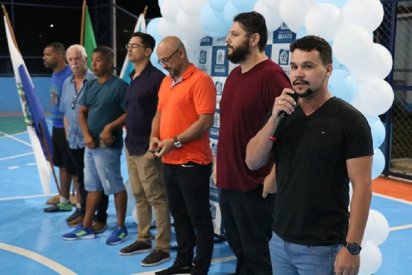 De carinha nova! A Prefeitura de Quatis realizou na noite da última quinta-feira (6) a cerimônia de entrega da obra de revitalização da Quadra Poliesportiva Jair da Rosa Pinto, conhecida como ‘Quadra do Mirão’, no bairro Mirandópolis. A obra teve início no final do ano passado e agora está pronta para atender os moradores da comunidade e os atletas que utilizam o local para a prática de esportes e atividades de lazer. “Nos empenhamos ao máximo para entregar uma estrutura de qualidade para os nossos moradores. Esta é mais uma obra de muita importância para todo o município e esperamos que todos possam utilizar o espaço e os equipamentos da melhor forma.” – comenta o secretário de Infraestrutura, Israel Cunha, que marcou presença na cerimônia. O evento também contou com a presença do prefeito Aluísio d’Elias, do secretário de Cultura, Esporte e Turismo, Leandro Sant’Anna, dos vereadores Casoba e André Jabuti, do ex-prefeito José Laerte d’Elias, e do morador Udson Bombom, que esteve representando a comunidade e também é um grande idealizador de projetos esportivos do bairro. Após a cerimônia, a mais nova quadra recebeu o amistoso entre os times Amigos do Bombom e Fúria Futebol Clube, para estrear com chave de ouro o novo espaço. “Nossa quadra foi revitalizada com muito trabalho prestado, observando e trabalhando em cada detalhe. Todos os aparelhos que estamos entregando serão bem utilizados e estamos elaborando mais projetos para serem implementados futuramente na área esportiva” – afirma o secretário Leandro Sant’Anna. Entusiasmado, o prefeito Aluísio também ressaltou a importância da entrega da obra para a comunidade. “Todos nós sabemos o quanto essa quadra é de grande referência no bairro e em toda a cidade. É nossa obrigação entregar uma obra tão importante como essa e fazer o dinheiro público voltar para a população através deste grande investimento na área do lazer. Isto é fruto de muito trabalho, dedicação e seriedade da gestão em entregar o melhor para a população. Estaremos sempre trabalhando para isso” – destaca.