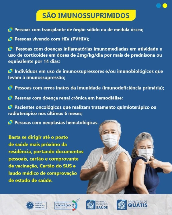 A Prefeitura de Quatis vai dar início a 2ª etapa da vacinação bivalente contra a Covid-19. A partir da próxima segunda-feira, dia 20 de março, idosos com 60 anos ou mais e gestantes e puérperas já podem receber a dose da vacina para garantir a proteção contra as variantes Ômicron, BA1, BA4 e BA5. Então, bora vacinar?Para receber a dose bivalente, além de fazer parte de um dos grupos prioritários, o munícipe deve estar com o esquema vacinal completo, com pelo menos 4 meses de intervalo desde a 2ª dose da vacina ou da última dose recebida, nos casos das doses de reforço. Basta se dirigir até o posto de saúde mais próximo da residência, portando documentos pessoais, cartão e comprovante de vacinação, Cartão do SUS e laudo médico de comprovação de estado de saúde (caso houver).A vacinação bivalente está acontecendo por etapas com seus respectivos grupos prioritários. Até o próximo dia 24 de abril, a campanha vai contar com 5 fases incluindo um público-alvo.Não deixe de vacinar! Vacinas salvam vidas.