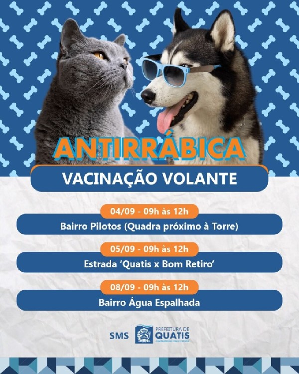 A Campanha de Vacinação Antirrábica segue acontecendo, de forma volante, em Quatis. Neste mês de setembro, a equipe da Divisão de Saúde e Bem-Estar Animal, da Prefeitura de Quatis, vai atender novas localidades do município, a partir desta quinta-feira (4). O serviço, que vai acontecer das 9h ao meio-dia, tem como objetivo imunizar cães e gatos contra a raiva e garantir a proteção animal. A etapa antecede o Dia D da campanha, que acontece no próximo dia 27. Confira as datas e localidades que serão atendidas nos próximos dias:Dia 04//09 (Quinta-feira)Bairro Pilotos (Quadra próximo à Torre)Dia 05/09 (Sexta-feira)Estrada ‘Quatis x Bom Retiro’Dia 08/09 (Segunda-feira)Bairro Água EspalhadaDia 09/09 (Terça-feira)Comunidade Joaquim LeiteDia 10/09 (Quarta-feira)Comunidade Quilombola de SantanaDia 12/09 (Sexta-feira)Estrada ‘Quatis x Glicério’