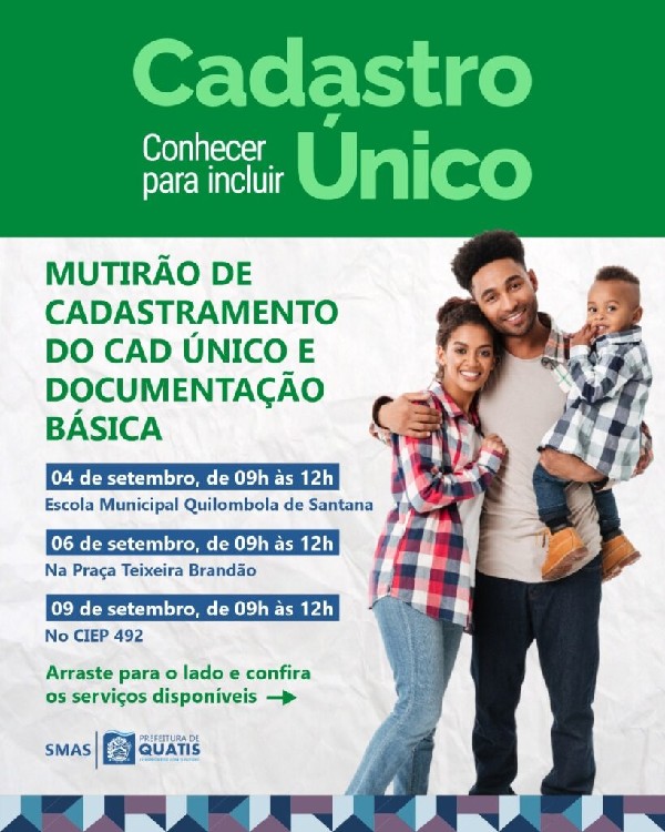 O mutirão de cadastramento do CadÚnico para Programas Sociais estará, no próximo mês, nos bairros Centro e Nossa Senhora do Rosário e na comunidade Quilombola de Santana, em Quatis. A ação, que é gratuita, acontecerá no sábado, dia 6, na Praça Dr. Teixeira Brandão, no centro da cidade; na quinta-feira (4), na Escola Municipal Quilombola de Santana Irmã Elizabeth Alves, em Santana; e na terça-feira (9), no CIEP 492 Municipalizado Marciana Machado de Elias, no bairro Nossa Senhora do Rosário. O horário de atendimento nas três localidades será das 9h ao meio-dia. Iniciativa da Prefeitura de Quatis, o objetivo é garantir o acesso à documentação básica e oferecer informações sobre os programas sociais do Governo Federal para a população. O serviço teve início em agosto, sendo desenvolvido pela equipe da Secretaria Municipal de Assistência Social (SMAS).