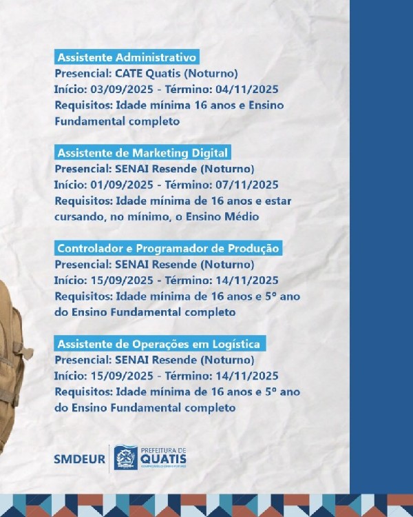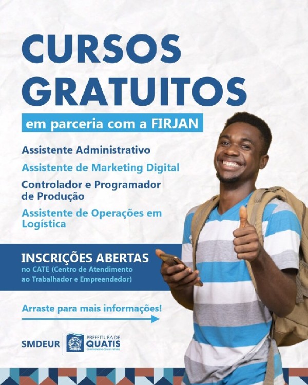 A Prefeitura de Quatis está com inscrições abertas para 4 cursos em parceria com a Federação das Indústrias do Estado do Rio de Janeiro (FIRJAN). As vagas são para assistente administrativo, assistente de Marketing Digital, controlador e programador de Produção e assistente de Operações em Logística. As inscrições já estão acontecendo no Centro de Atendimento ao Trabalhador e Empreendedor – CATE de Quatis. A unidade fica na Rua Nossa Senhora do Rosário, nº 185, no centro da cidade, e funciona de segunda à sexta-feira, das 8h às 17h.
