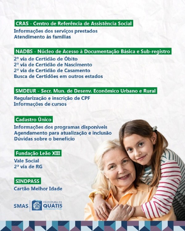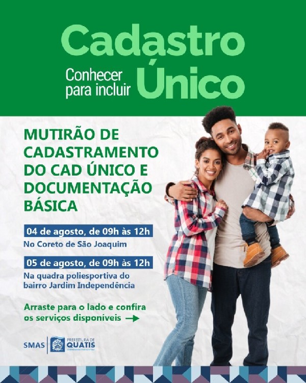 A Prefeitura de Quatis vai promover, no próximo mês, um mutirão de cadastramento do CadÚnico para Programas Sociais. Nesta primeira etapa, a ação acontecerá no distrito de Ribeirão de São Joaquim, no dia 4, no coreto; e no bairro Jardim Independência, no dia 5, na Quadra Poliesportiva da comunidade. O horário de atendimento é das 9h ao meio-dia. O objetivo, segundo a Secretaria Municipal de Assistência Social (SMAS), é garantir o acesso à documentação básica e oferecer informações sobre os programas sociais do Governo Federal para a população, como Cartão Melhor Idade, serviços do CRAS, NADBS, Cadastro Único, Fundação Leão XIII e serviços da Secretaria Municipal de Desenvolvimento Econômico Urbano e Rural.Confira:CRASInformações dos serviços ofertadosAtendimento às famíliasCadastro Único (CadÚnico)Informações dos programas disponíveis para a populaçãoAgendamento para atualização e inclusão no CadÚnicoDúvidas sobre benefícioNúcleo de Acesso à Documentação Básica e Sub-Registro (NADBS)2ª via de certidão de óbito2ª via de certidão de nascimento2ª via de certidão de casamentoBusca de certidões em outros estadosSecretaria de Desenvolvimento Econômico Urbano e RuralRegularização e inscrição de CPFInformações de cursosFundação Leão XIIIVale Social2ª via de RGSINDPASSCartão Melhor IdadeO Mutirão de Acesso à Documentação Básica acontecerá até setembro, em diversas localidades do município de Quatis. As datas e os locais das próximas ações serão divulgadas em breve.