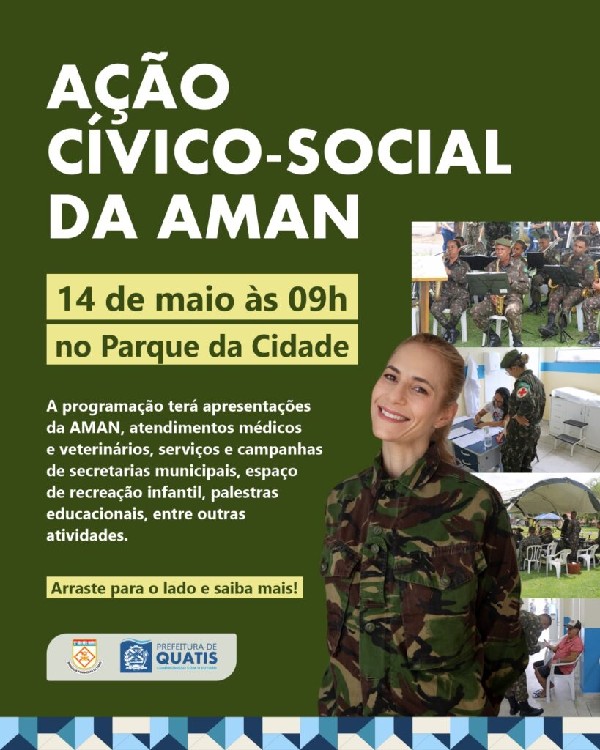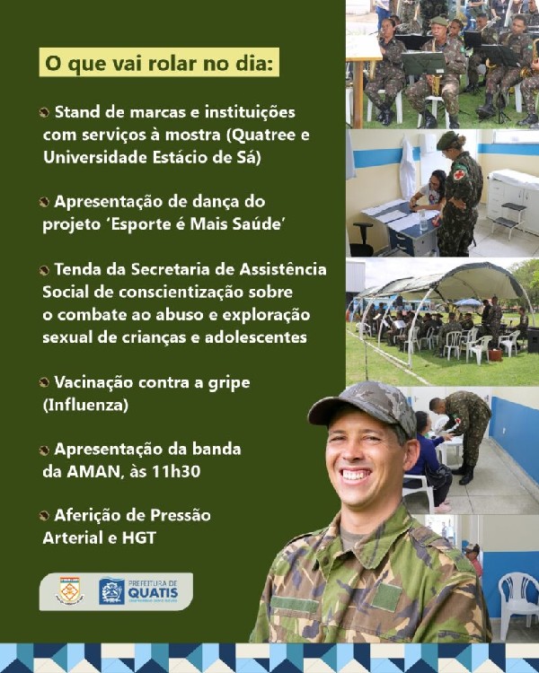 óxima quarta-feira, dia 14, a Ação Cívico-Social em Quatis. O evento rola das 9h às 15 horas, na Praça Cílios do Paraíba, no Parque da Cidade, no bairro Jardim Polastri. A ação, que é uma iniciativa da Academia Militar das Agulhas Negras (AMAN), em parceria com a Prefeitura de Quatis, leva serviços culturais e de saúde gratuitos para toda a população. A programação terá apresentações da AMAN, atendimentos médicos e veterinários, serviços e campanhas de secretarias municipais, espaço de recreação infantil, palestras educacionais, entre outras atividades. Confira o que vai rolar no dia: