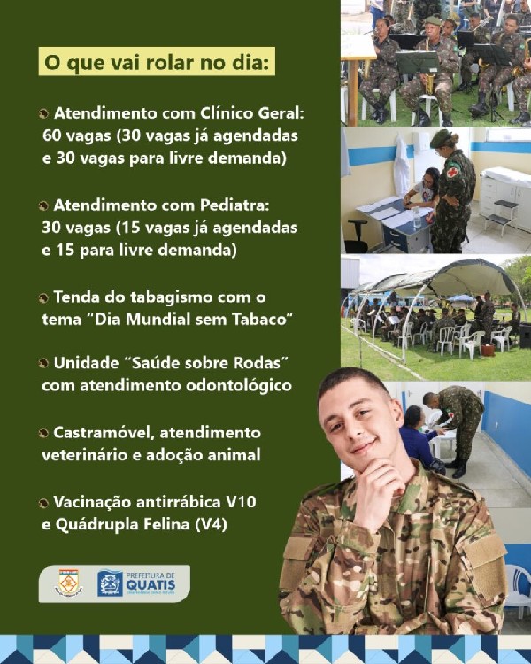 Vai acontecer na próxima quarta-feira, dia 14, a Ação Cívico-Social em Quatis. O evento rola das 9h às 15 horas, na Praça Cílios do Paraíba, no Parque da Cidade, no bairro Jardim Polastri. A ação, que é uma iniciativa da Academia Militar das Agulhas Negras (AMAN), em parceria com a Prefeitura de Quatis, leva serviços culturais e de saúde gratuitos para toda a população. A programação terá apresentações da AMAN, atendimentos médicos e veterinários, serviços e campanhas de secretarias municipais, espaço de recreação infantil, palestras educacionais, entre outras atividades. Confira o que vai rolar no dia:Atendimento com Clínico Geral: 60 vagas (30 vagas já agendadas e 30 vagas para livre demanda);Atendimento com Pediatra: 30 vagas (15 vagas já agendadas e 15 para livre demanda);Vacinação contra a gripe (Influenza);Aferição de Pressão Arterial e HGT;Tenda do tabagismo com o tema “Dia Mundial sem Tabaco”;Unidade móvel “Saúde sobre Rodas” com atendimento odontológico;Castramóvel;Atendimento veterinário;Adoção Animal;Vacinação antirrábica V10 e Quádrupla Felina (V4);Stand de marcas e instituições com serviços à mostra (Quatree e Universidade Estácio de Sá);Apresentação de dança do projeto ‘Esporte é Mais Saúde’;Tenda da Secretaria de Assistência Social com panfletagem de conscientização sobre o mês de combate ao abuso e exploração sexual de crianças e adolescentes;Apresentação da banda da AMAN, às 11h30;