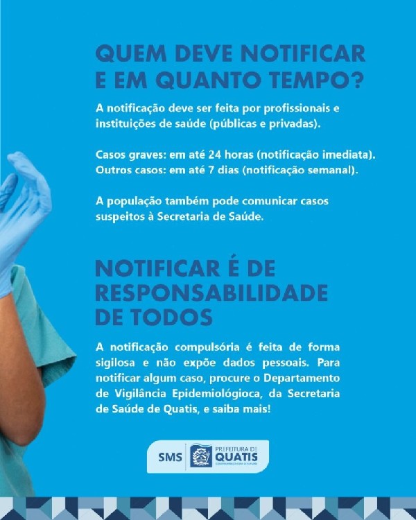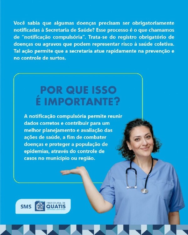 A Prefeitura de Quatis chama atenção para esse tema muito importante e que deve ser levado a sério quando o assunto é saúde pública.Nesse post, você vai entender o que é notificação compulsória, a sua importância e como você pode contribuir para ajudar a proteger a cidade.Então, veja as imagens e saiba mais!