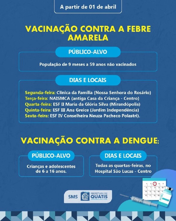 A Prefeitura de Quatis vai dar início, na próxima terça-feira (1º), à nova campanha de vacinação contra doenças virais. O objetivo, segundo a Secretaria Municipal de Saúde (SMS), é intensificar a imunização de toda população e cumprir com o esquema de vacinação na cidade. Os imunizantes disponíveis incluem a Tríplice Viral, que protege contra Sarampo, Caxumba e Rubéola, além de imunizantes contra outras endemias, como Febre Amarela, Covid-19 e Dengue.A ação acontecerá em todas as unidades de Estratégia da Saúde da Família (ESF’s) de Quatis, de acordo com um calendário com dias e locais para cada etapa de vacinação, que também terá um público-alvo específico. Para se vacinar, o munícipe deve comparecer à unidade mais próxima, tendo em mãos cartão do SUS e caderneta de vacinação. O ato de imunização acontece das 9h às 16 horas.Confira o calendário completo e o público-alvo de cada vacinação:VACINAÇÃO CONTRA SARAMPO, CAXUMBA E RUBÉOLA (Triviral)Público-Alvo:Criança de até 4 anos, 11 meses e 29 dias: 1º dose (aos 12 meses de idade) e 2ª dose (aos 15 meses);De 5 anos até 29 anos de idade – duas doses (verificar comprovação vacinal anterior);De 30 anos até 59 anos, 11 meses e 29 dias – uma dose (verificar comprovação vacinal anterior);Trabalhadores de Saúde em atuação: duas doses, independentemente da idade (verificar comprovação vacinal anterior).Dias e Locais de Vacinação:Segunda-feira: Clínica da Família, bairro Nossa Senhora do Rosário;Terça-feira: ESF III Ana Greice, bairro Jardim Independência;Quarta-feira: ESF II Maria da Glória Silva, bairro Mirandópolis;Quinta-feira: NAISMCA (antiga Casa da Criança), no Centro;Sexta-feira: ESF IV Conselheira Neuza Pacheco, bairro Jardim Polastri.VACINAÇÃO CONTRA A FEBRE AMARELAPúblico-alvo:População de 9 meses a 59 anos não vacinados.Dias e Locais de Vacinação:Segunda-feira: Clínica da Família, bairro Nossa Senhora do Rosário;Terça-feira: NAISMCA (antiga Casa da Criança), no Centro;Quarta-feira: ESF II Maria da Glória Silva, bairro Mirandópolis;Quinta-feira: ESF III Ana Greice, bairro Jardim Independência;Sexta-feira: ESF IV Conselheira Neuza Pacheco, bairro Jardim Polastri.VACINAÇÃO CONTRA A COVID-19Público-alvo:Crianças de 6 meses a menores de 5 anos de idade;Gestantes (1 dose a cada gestação);Pessoas com 60 anos ou mais de idade e pessoas imunocomprometidas (1 dose a cada 6 meses com esquema completo);1 dose a cada 12 meses para grupos em caráter especial – adolescentes e jovens em medida socioeducativa, funcionário do sistema de privação de liberdade, indígenas vivendo ou não em terra indígenas, pessoas vivendo em longa permanência, pessoas com deficiência permanente, pessoas privadas de liberdade, ribeirinhos e quilombolas, pessoas em situação de rua e trabalhadores de saúde.Dias e Locais de Vacinação:Segunda e Quarta-feira:Clínica da Família, bairro Nossa Senhora do Rosário;NAISMCA (antiga Casa da Criança), no Centro;ESF IV Conselheira Neuza Pacheco, bairro Jardim Polastri.Terça e Quinta-feira:ESF II Maria da Glória Silva, bairro Mirandópolis;ESF III Ana Greice, bairro Jardim Independência;VACINAÇÃO CONTRA A DENGUE:Público-alvo:Crianças e adolescentes de 6 a 16 anos.Dia e Local de Vacinação:Todas as quartas-feiras, no Hospital São Lucas – Centro.