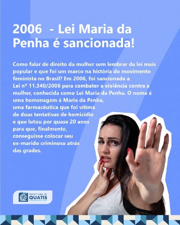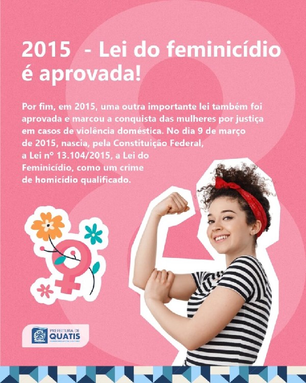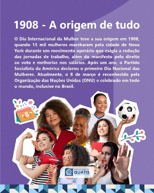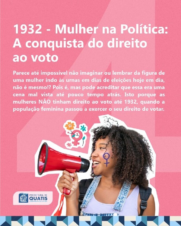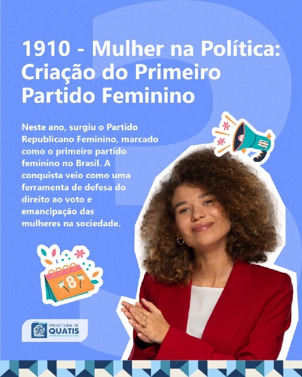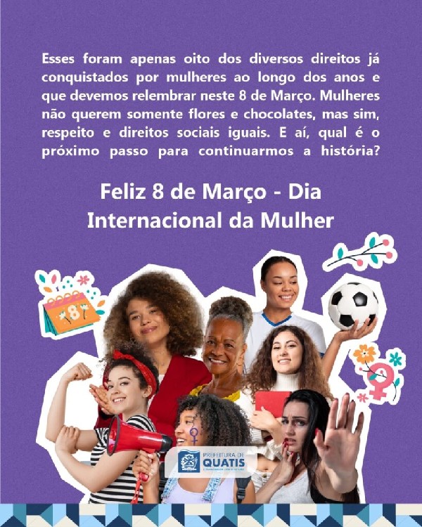 ábado, dia 8 de Março, o Dia Internacional da Mulher, e a Prefeitura de Quatis separou 8 grandes fatos históricos que marcaram a luta e a conquista das mulheres ao longo dos anos no Brasil para relembrarmos a importância desta data em todo o mundo.