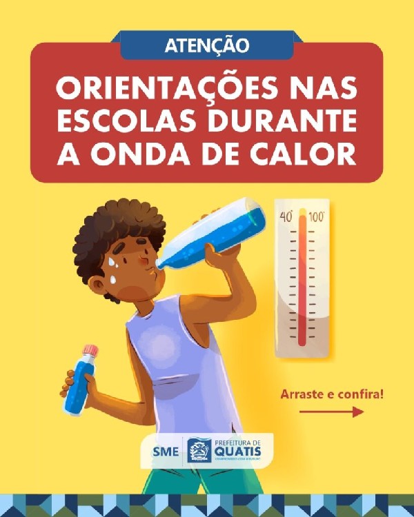 A PMQ preparou um conteúdo mega importante para ser seguido nesta semana de altas temperaturas no município, com o objetivo de garantir o bem-estar de alunos, professores e de toda a comunidade escolar.A Secretaria Municipal de Educação (SME) reforçou o abastecimento de água nas unidades escolares com o envio de copinhos de água mineral para alunos e profissionais.E nesse calorão nada melhor do que um açaizinho bem gostoso e refrescante, não é mesmo? Como medida complementar e visando contribuir para a nutrição e hidratação dos alunos, a merenda escolar passará a ter distribuição de açaí.Além das dicas e novidades na refeição escolar, as escolas municipais também seguem preparadas para atender os alunos da melhor forma e garantindo o bem-estar dos estudantes nesta semana de calor extremo.Estudar com saúde e cuidados sempre!