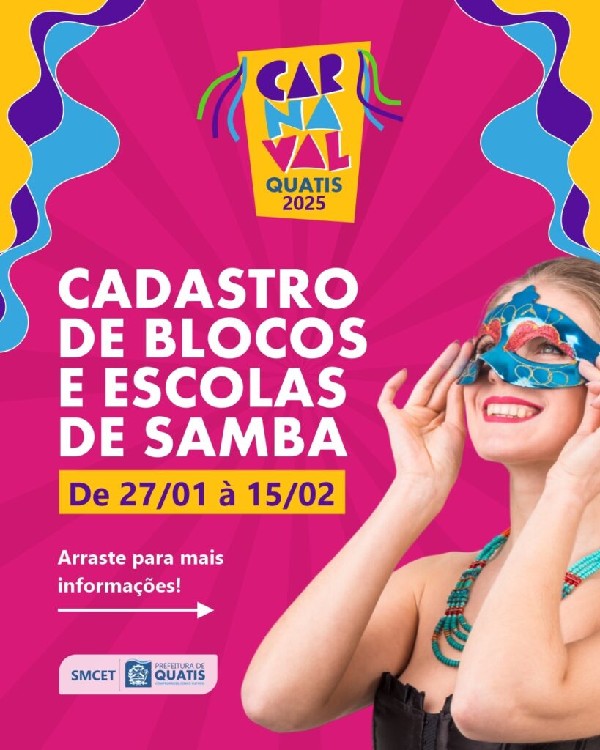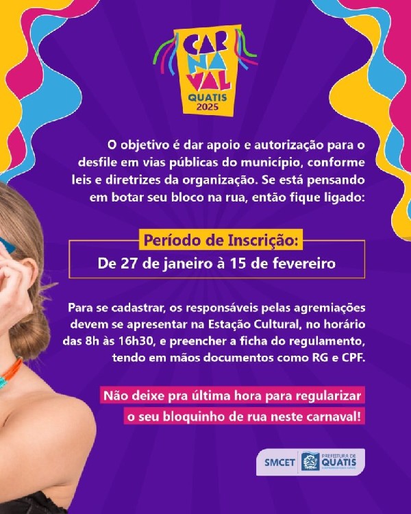 ês para o Carnaval 2025. E os interessados em desfilar com blocos e escolas de samba nas ruas durante as festas carnavalescas devem se preparar para o período de cadastramento de autorização e regulação, que começa nesta segunda-feira (27), em Quatis. Uma medida da Prefeitura Municipal, o objetivo é dar apoio e autorização para o desfile em vias públicas do município, conforme leis e diretrizes da organização.