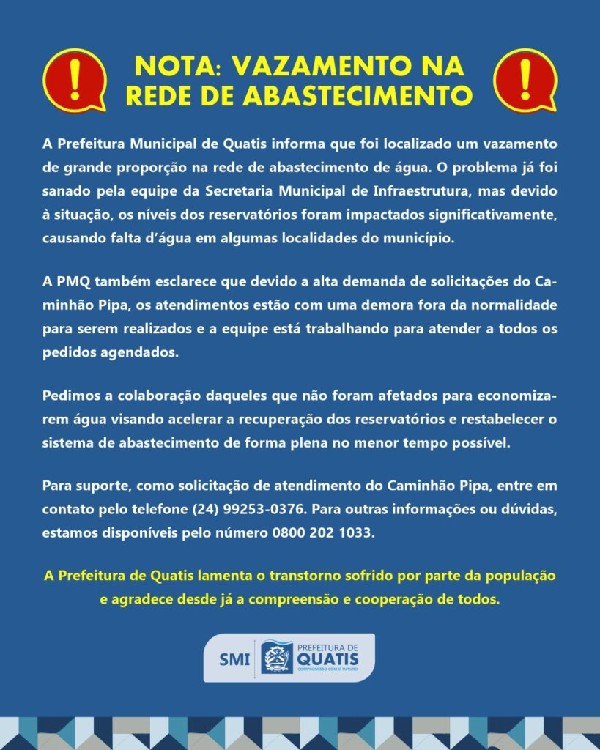 A Prefeitura Municipal de Quatis informa que foi localizado um vazamento de grande proporção na rede de abastecimento de água. O problema já foi sanado pela equipe da Secretaria Municipal de Infraestrutura, mas devido à situação, os níveis dos reservatórios foram impactados significativamente, causando falta d'e1gua em algumas localidades do município.A PMQ também esclarece que devido a alta demanda de solicitações do Caminhão Pipa, os atendimentos estão com uma demora fora da normalidade para serem realizados e a equipe está trabalhando para atender a todos os pedidos agendados.Pedimos a colaboração daqueles que não foram afetados para economizarem água visando acelerar a recuperação dos reservatórios e restabelecer o sistema de abastecimento de forma plena no menor tempo possível.Para suporte, como solicitação de atendimento do Caminhão Pipa, entre em contato pelo telefone (24) 99253-0376. Para outras informações ou dúvidas, estamos disponíveis pelo número 0800 202 1033.A Prefeitura de Quatis lamenta o transtorno sofrido por parte da população e agradece desde já a compreensão e cooperação de todos.