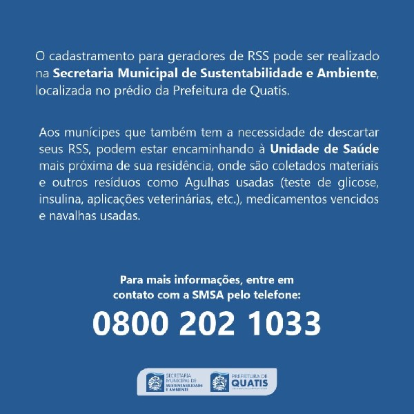 Já sabe o que são os RSS? Então já fique ligado e saiba mais como funciona!A coleta de Resíduos Sólidos de Saúde (RSS) é destinada a estabelecimentos que geram resíduos contaminantes com material humano, animal ou medicamentos presentes em clínicas, veterinárias e farmácias. Dessa forma, esses materiais requererem um ambiente específico e propício para serem descartados e este descarte é muito importante para o meio ambiente.Para que a Secretaria Municipal de Sustentabilidade e Ambiente (SMSA) tenha controle dos pontos de coleta, é necessário que trabalhadores da área, que precisam realizar este tipo de descarte, os chamados de geradores de Resíduos Sólidos de Saúde (RSS), façam o cadastro.O cadastramento para geradores de RSS pode ser realizado na Secretaria Municipal de Sustentabilidade e Ambiente (SMSA), localizada no prédio da Prefeitura de Quatis.Para o cadastro, são necessários os seguintes documentos:Cartão do CNPJ.Alvará de Localização e Funcionamento.Certidão Negativa de Débitos Municipal.Documento de identificação com foto do proprietário.Aos munícipes que também tem a necessidade de descartar seus RSS, podem estar encaminhando à Unidade de Saúde mais próxima de sua residência, onde são coletados materiais e outros resíduos como:Agulhas usadas (teste de glicose, insulina, aplicações veterinárias, etc.).Medicamentos vencidos.Navalhas usadas.Para mais informações, entre em contato com a Secretaria de Sustentabilidade e Ambiente pelo telefone 0800 202 1033.