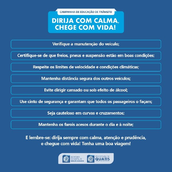 A Prefeitura de Quatis inicia agora uma nova Campanha de Educação de Trânsito. O assunto da vez é viagens e direção defensiva.Sabemos que janeiro é conhecido como um mês mais atrativo entre os turistas para se viajar, devido às férias de verão e início de ano. Por isso, para se ter um passeio com segurança, é necessário redobrar a atenção no trânsito durante a viagem.Pensando nisso, separamos algumas dicas para você adotar nesta época de viagens e garantir a sua segurança e a de sua família no trânsito:Verifique a manutenção do veículo;Certifique-se de que freios, pneus e suspensão estão em boas condições;Respeite os limites de velocidade e condições climáticas;Mantenha distância segura dos outros veículos;Evite dirigir cansado ou sob efeito de álcool;Use cinto de segurança e garantam que todos os passageiros o façam;Seja cauteloso em curvas e cruzamentos;Mantenha os farois acesos durante o dia e à noite;E lembre-se: dirija sempre com calma, atenção e prudência, e chegue com vida! Tenha uma boa viagem!