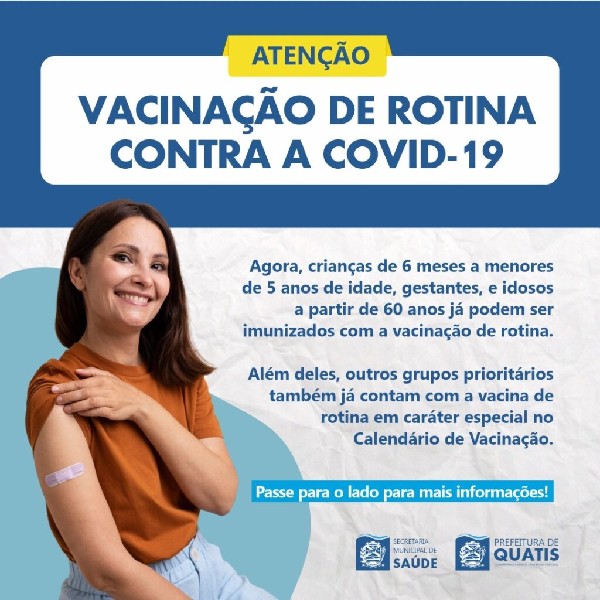 A Prefeitura de Quatis ampliou os grupos prioritários que passaram a receber a vacina contra a Covid-19 em caráter de rotina no Calendário Nacional de Vacinação. A medida segue a 2º edição da Estratégia de Vacinação contra a Covid-19, publicada pelo Ministério da Saúde. Segundo a Secretaria Municipal de Saúde (SMS), o objetivo é reforçar o combate à doença na cidade e ainda garantir o esquema vacinal completo da população.Agora, crianças de 6 meses a menores de 5 anos de idade, gestantes e idosos a partir de 60 anos já podem ser imunizados com a vacinação de rotina. Além deles, outros grupos prioritários também já contam com a vacina de rotina em caráter especial no Calendário de Vacinação. Saiba mais abaixo:Grupos que passaram a receber a vacina de rotina:Crianças de 6 meses a menores de 5 anos de idade;Gestantes (1 dose a cada gestação)Pessoas com 60 anos ou mais de idade (1 dose a cada 6 meses com esquema completo).Grupos que passaram a receber a vacina de rotina em caráter especial:Pessoas vivendo em longa permanência (1 dose a cada 12 meses com esquema completo);Pessoas imunocomprometidas (1 dose a cada 6 meses com esquema completo);Indígenas vivendo ou não em terra indígena (1 dose a cada 12 meses com esquema completo);Ribeirinhos (1 dose a cada 12 meses com esquema completo);Quilombolas (1 dose a cada 12 meses com esquema completo);Puérperas (dose única);Trabalhadores de Saúde (1 dose a cada 12 meses com esquema completo);Pessoas com deficiência permanente (1 dose a cada 12 meses com esquema completo);Pessoas privadas de liberdade (1 dose a cada 12 meses com esquema completo);Funcionários do sistema de privação de liberdade (1 dose a cada 12 meses com esquema completo);Adolescentes e jovens cumprindo medida socioeducativas (1 dose a cada 12 meses com esquema completo);Pessoas em situação de rua (1 dose a cada 12 meses com esquema completo).Onde vacinar?Para gestantes, crianças e adolescentes, a vacinação acontece segunda e quarta-feira, das 9h às 16 horas, no Núcleo de Atenção Integrada à Saúde da Mulher, Criança e Adolescente(NAISMCA), antiga Casa da Criança. Para os outros grupos, a ação ocorre segunda e quarta-feira, das 9h às 16 horas, na Unidade de Saúde ESF II Maria da Glória Silva, no bairro Mirandópolis, e terça e quinta-feira, no mesmo horário, na Clínica da Família, no bairro Nossa Senhora do Rosário.