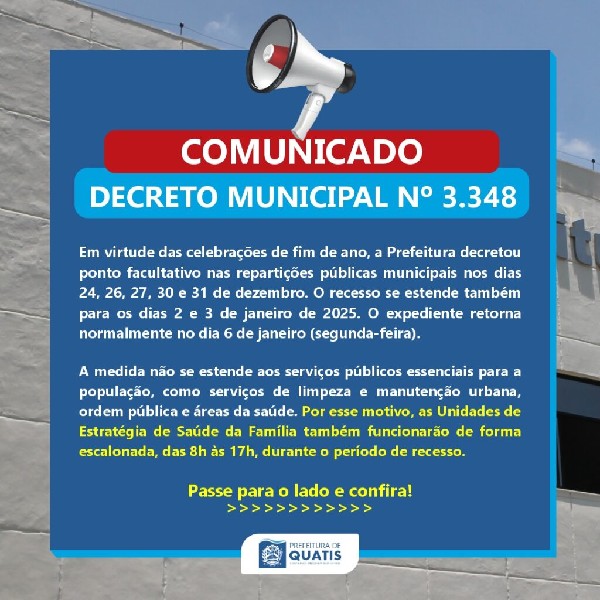 Em virtude das celebrações das festas de fim de ano, como Natal e Ano Novo, a Prefeitura de Quatis decretou ponto facultativo nas repartições públicas municipais. Dessa forma, não haverá expediente nos dias 24, 26, 27, 30 e 31 de dezembro. O recesso se estende também para os primeiros dias de janeiro de 2025, nos dias 2 e 3 do próximo mês. O expediente retorna normalmente no dia 6 de janeiro (segunda-feira).A medida não se estende aos serviços públicos considerados essenciais para a população, como serviços de limpeza e manutenção urbana, ordem pública e áreas da saúde. Por esse motivo, as Unidades de Estratégia de Saúde da Família (ESF’s) também funcionarão de forma escalonada, das 8h às 17h, durante o período de recesso. Confira:23/12 (segunda-feira) – Todas as Unidades em funcionamento;26/12 (quinta-feira) – Núcleo de Atenção Integrante à Saúde da Mulher, Criança e Adolescente – NAISMCA (antiga Casa da Criança);27/12 (sexta-feira) – ESF IV – Conselheira Neuza Pacheco (bairro Jardim Polastri) e Farmácia Municipal;30/12 (segunda-feira) – Clínica da Família (bairro Nossa Senhora do Rosário);02/01 (quinta-feira) – ESF II Maria da Glória (Mirandópolis);03/01 (sexta-feira) – ESF III Ana Greice (Jardim Independência) e Farmácia Municipal;O Decreto Municipal nº 3.348 foi publicado nesta quinta-feira (19) e já está disponível no Portal da Transparência, no site oficial da administração municipal. Para acessá-lo, basta o munícipe entrar pelo link https://quatis.aexecutivo.com.br/decretos.php?id=1590A PMQ aproveita para desejar a todos um Feliz Natal e um próspero Ano Novo! Boas Festas!